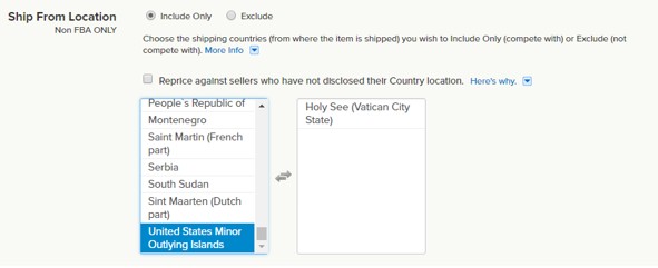 We normally recommend you add an inclusion by seller location such as Vatican City (as shown below). That way you’ll have no competition possible and you’ll go to Max automatically until the system detects you’re not in a price war anymore and you’ll go back to your original rule.