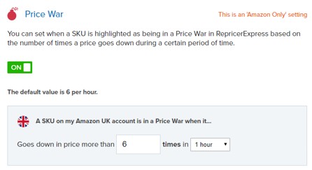 Within the Product Status Preferences screen in RepricerExpress, you’ll be able to easily set what a price war is to you — after how many price changes within X hours you consider yourself in a price war.