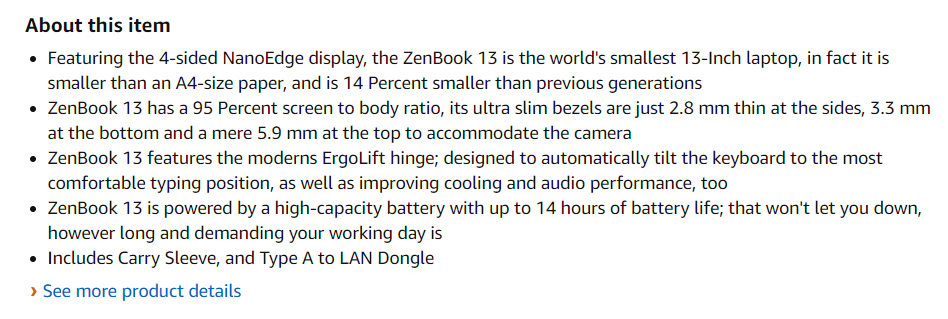 Each bullet point can be up to 15 words each (maximum of 500 characters in each bullet) and should describe a notable highlight of the product. A good example of this would be writing about your laptop’s processor type and speed; a not-so-good example would be to write about the accessories that are included (e.g. extra charging cable, carrying case, etc.).