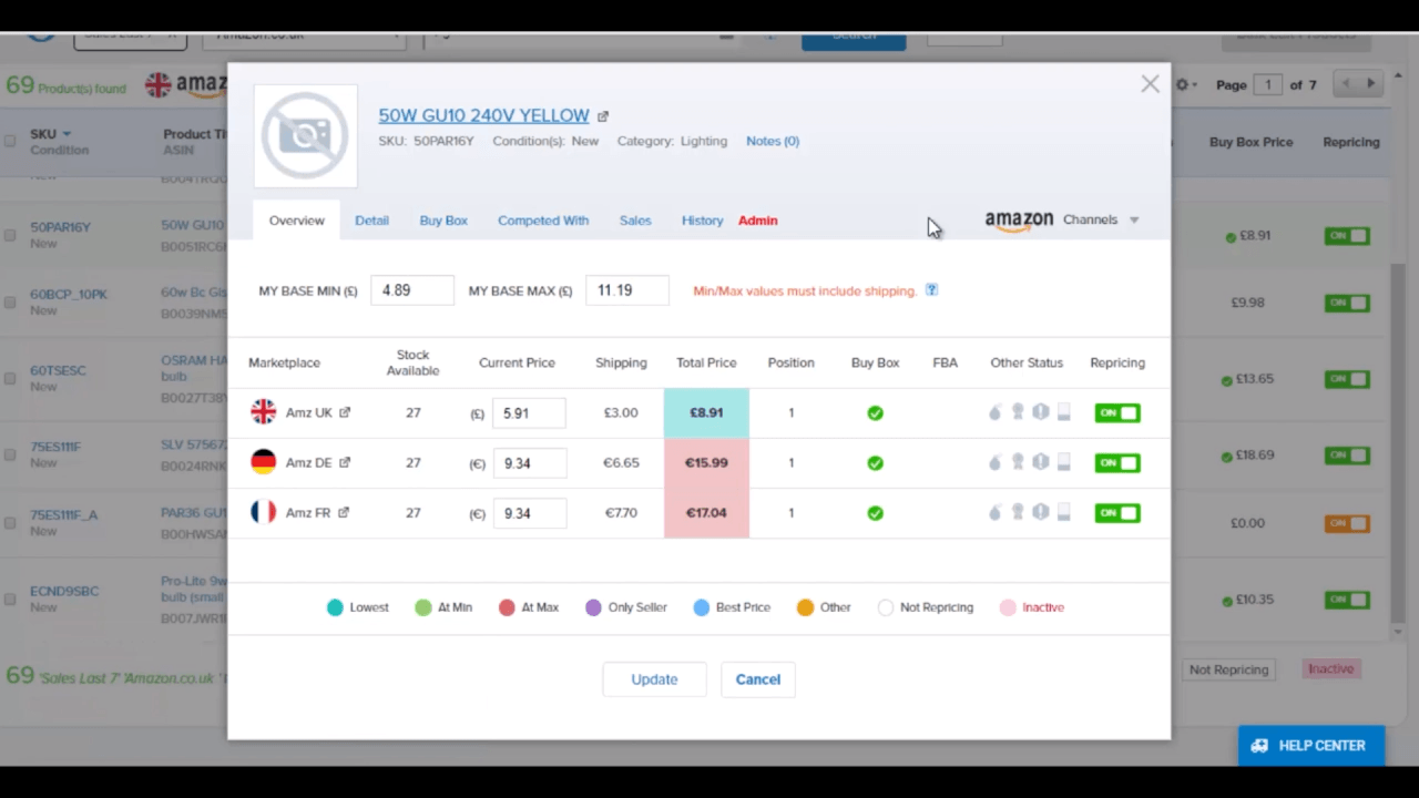 - The Overview tab is a basic overview of your product, highest repricing, as well as being able to control your min/max prices.