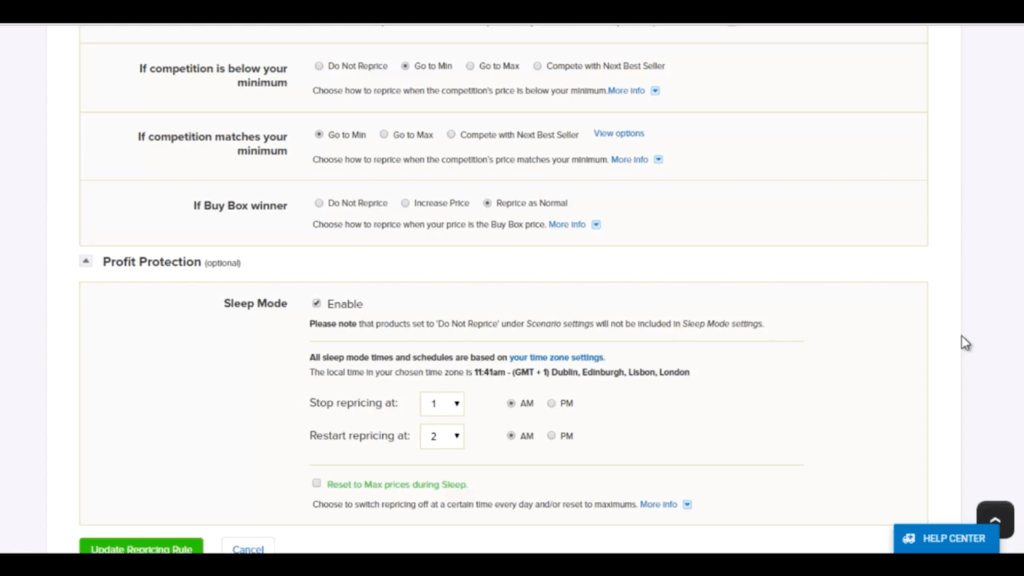 We also have our Profit Protection section with sleep mode. Sleep mode basically allows you to completely turn off repricing within certain hours of the day.