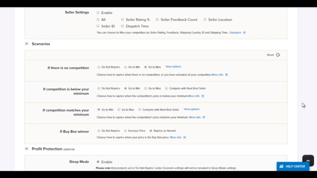 In Scenario section, you can also fine-tune what your product will do in certain scenarios, for example, if there are no competitors, if there’s competition below your minimum price, or even if you have the buy box. This is very useful for fine-tuning how your rules are going to work.
